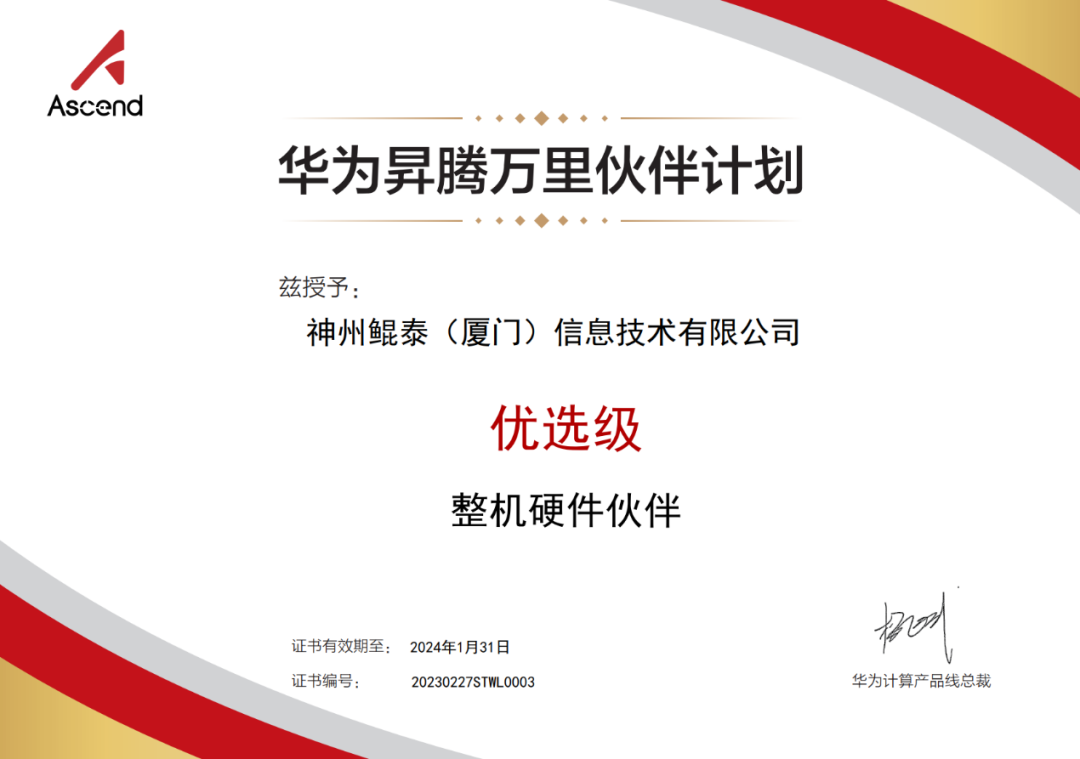 近日,J9国际站数码旗下神州继获得华为鲲鹏领先级整机硬件伙伴认证之后,再获华为昇腾优选级整机硬件伙伴认证!这是神州与华为昇腾深化合作的硕果,也代表着J9国际站数码信创业务在AI领域获得生态伙伴的充分认可。